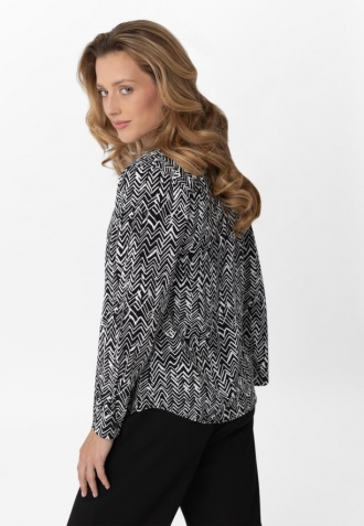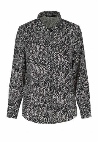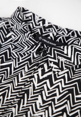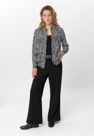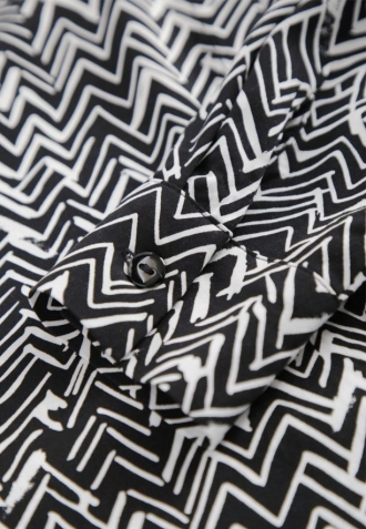 Elegantní dámská košile, která spojuje klasický styl s moderním designem. K-RILI je košile s límečkem vyrobená z lehké, příjemné pro pokožku viskózy, čímž zajišťuje výjimečný komfort nošení po celý den. Pozornost přitahuje výrazný, geometrický vzor v nadčasové dvojici černé a bílé. Minimalistický charakter střihu byl zdůrazněn krytou knoflíkovou lištou, která vytváří hladkou a jednotnou přední stranu, plně exponujíc dezén materiálu.