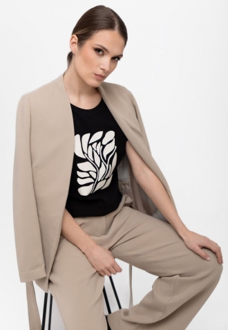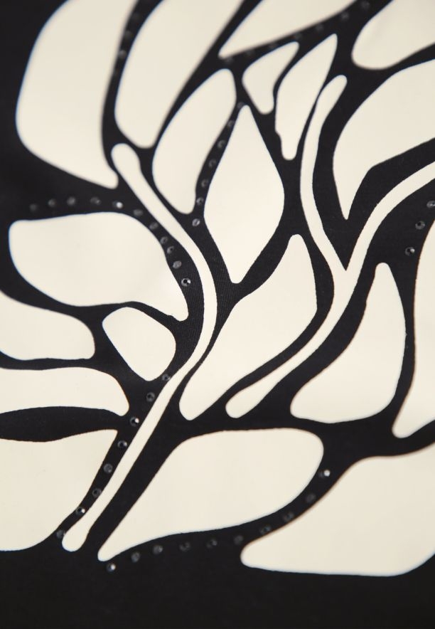 Dámské tričko v černé barvě má klasický střih a výrazný styl. Pozornost si zaslouží dekorativní potisk s rostlinným motivem v centrální části trička. Kontrastní bílá na černém pozadí přitahuje zrak a dodává celku originální, moderní charakter. Je to ideální volba pro ženy, které mají rády klasiku s uměleckým akcentem a cení si pohodlí ve stylovém provedení.