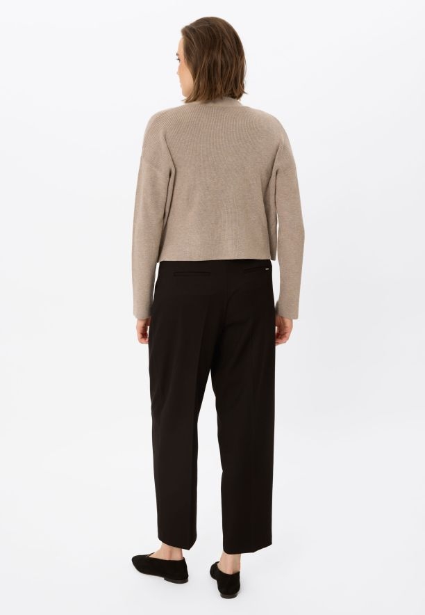 Svetr - dámský kardigan se vyznačuje zkráceným, volným střihem, který se ideálně kombinuje jak s vysokým pasem kalhot nebo sukní, tak s delšími topy, čímž vytváří zajímavé proporce. Copánkový úplet, dlouhé rukávy a minimalistické provedení bez zapínání podtrhují jeho nadčasový charakter. Tento model je vynikající volbou pro ženy, které si cení spojení pohodlí, módního designu a všestrannosti, snadno se přizpůsobí casualovým i elegantnějším outfitům.