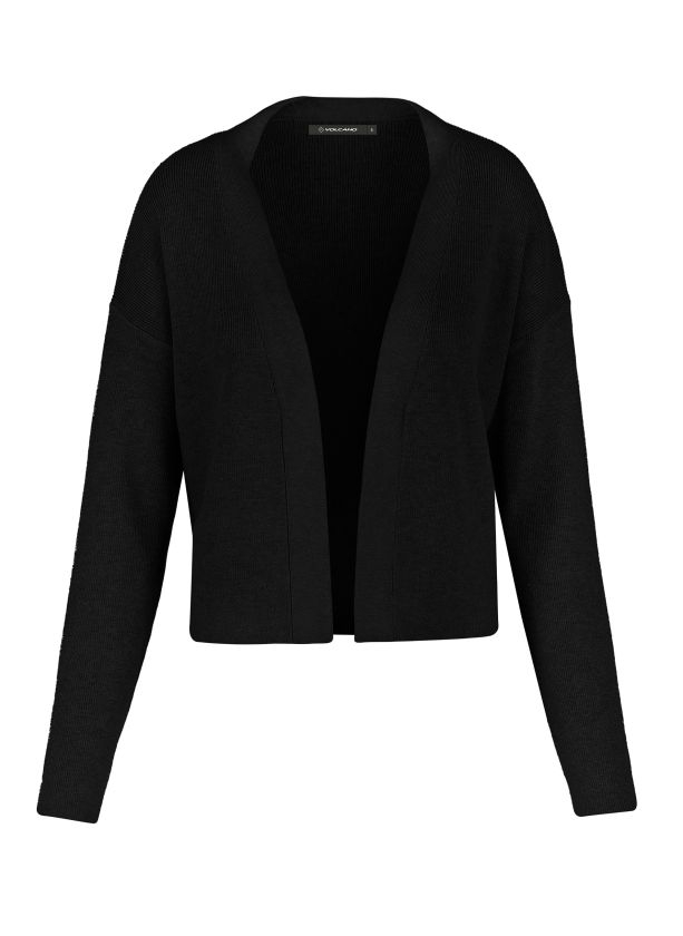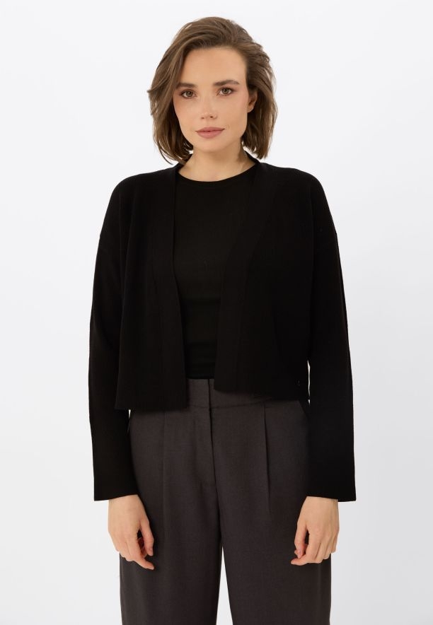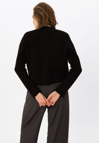Svetr S-MIGA v černé barvě je krátký a bez zapínání. Ušitý z 80 % viskózy zajišťuje prodyšnost a vzdušnost, což v kombinaci s volným střihem zaručuje komfort nošení. Navíc jeho volný střih se sníženou linií ramen také způsobuje, že rozepínací svetr krásně sedí na těle, zaručuje volnost pohybu a dodává lehkost celé stylizaci. Klasický výstřih do V, přecházející v otevřené přední díly, podtrhuje jeho univerzálnost a umožňuje různorodé kombinace.