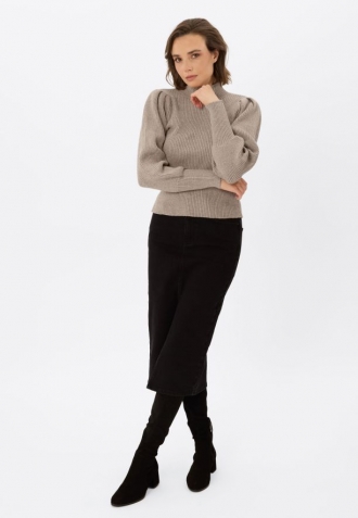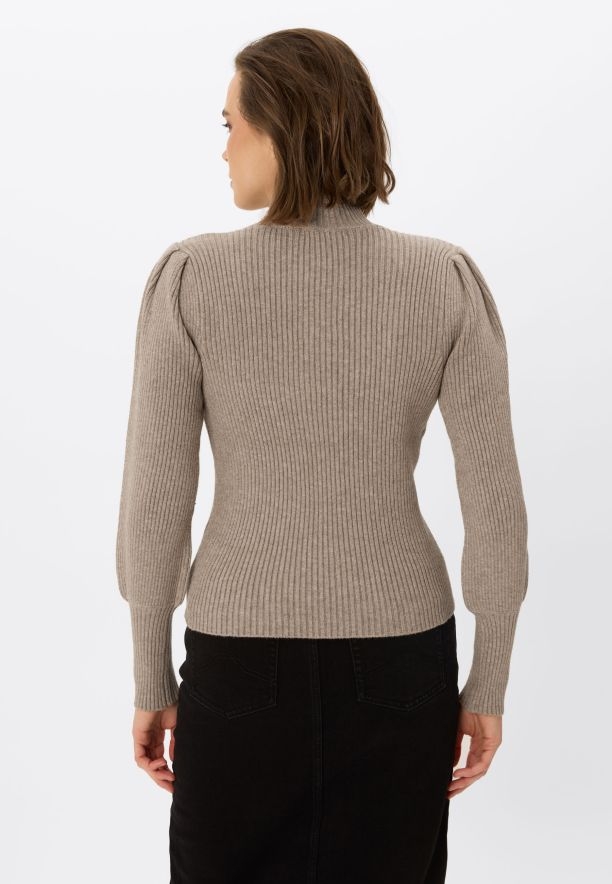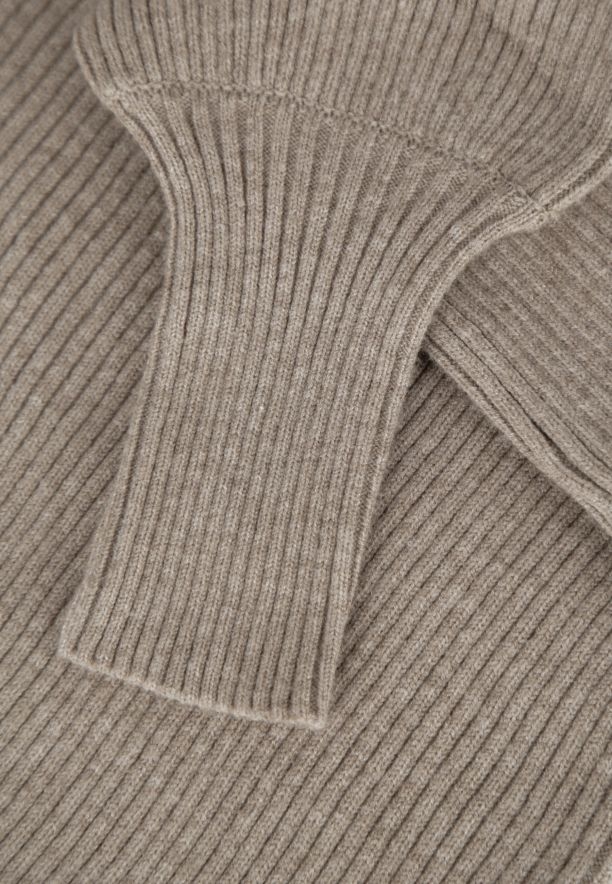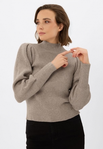 Svetr v béžové barvě má charakteristický žebrovaný vzor, který se táhne svisle, což opticky prodlužuje a jemně zvýrazňuje siluetu, dodávající jí štíhlost. Svetr se vyznačuje módními, nabíranými rukávy, které mu dodávají originalitu a lehce retro, a zároveň současný charakter. Polorolák obepíná krk, zajišťuje pohodlí a teplo. Díky svému střihu a ideálnímu přizpůsobení postavě svetr dokonale zvýrazňuje ženské tvary, zároveň zajišťuje volnost pohybu.