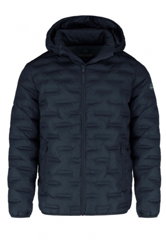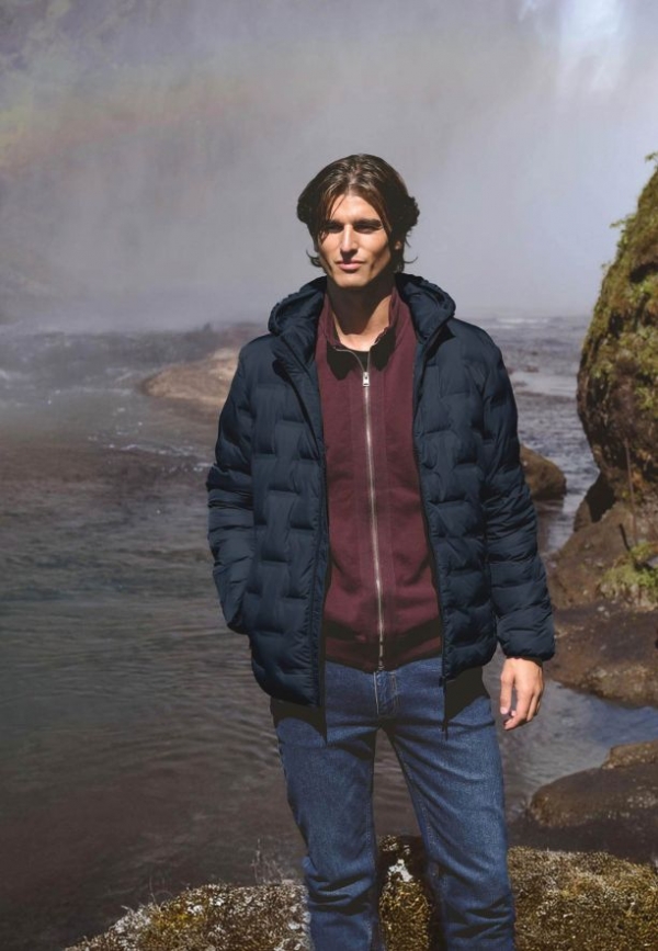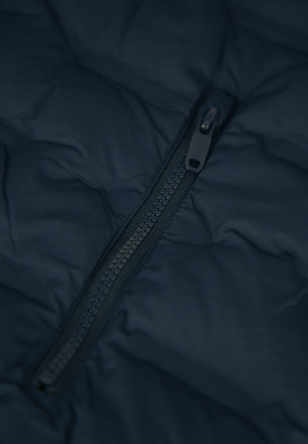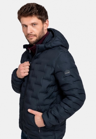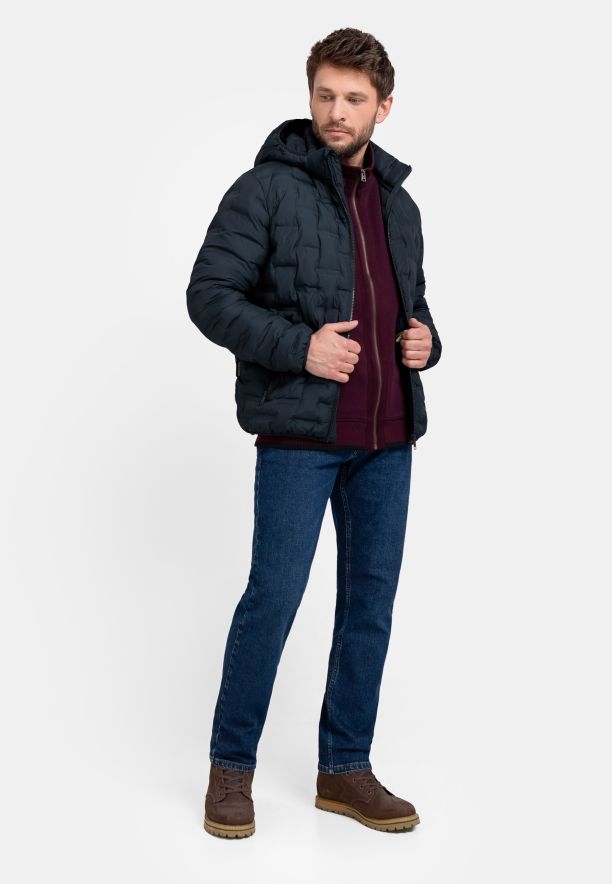 Tmavě modrá prošívaná bunda s kapucí je vynikající volbou pro chladné dny! Její prošívání a lehká konstrukce zajišťují optimální teplo, a navíc charakteristické vodorovné prošívání, tvořící nepravidelné, geometrické vzory, jí dodává dynamický a svěží vzhled, odlišující ji od tradičních péřových bund. Přechodná bunda je vybavena praktickou, odnímatelnou kapucí, která účinně chrání před větrem a deštěm, a také dvěma diskrétně začleněnými kapsami se zapínáním na zipy, ideálními pro uložení drobných předmětů nebo zahřátí rukou. Spodní lem bundy a manžety jsou zakončené elastickou lemovkou, což zabraňuje profouknutí a pomáhá udržet teplo.