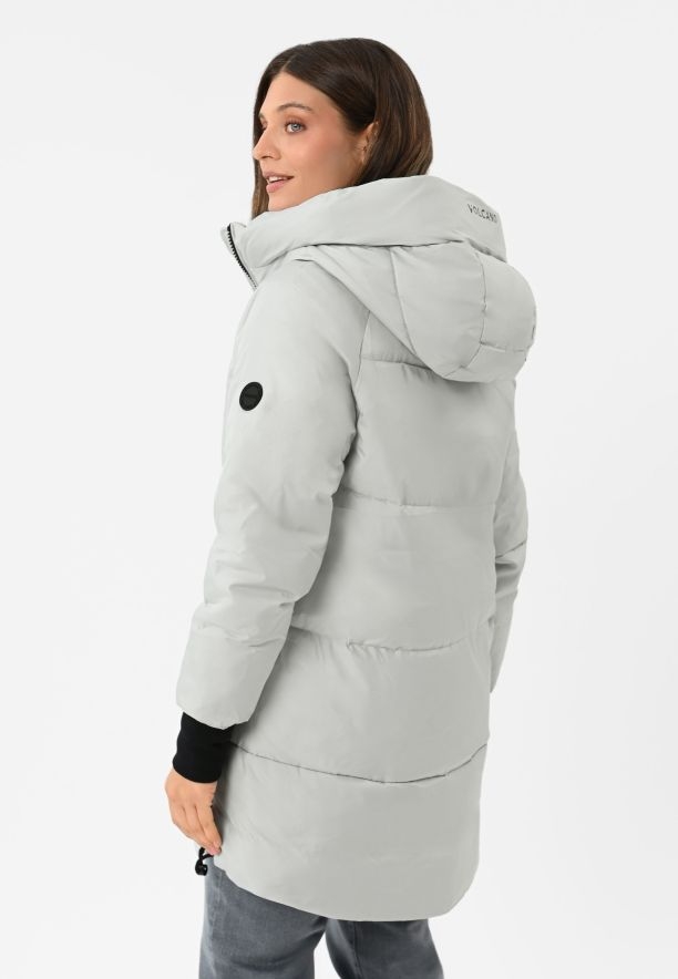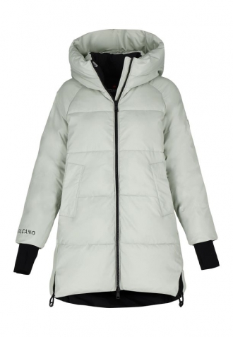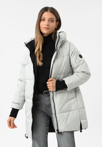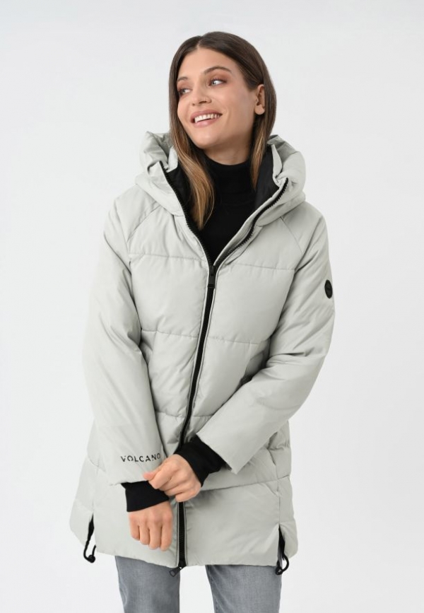 Seznamte se s novou zimní bundou pro ženy značky Volcano. J-FROZEN je světle šedý zimní kabát, který zaujme originálním designem a funkčností. Tento prošívaný dámský kabát účinně chrání před chladem díky výplni z umělého peří. Integrovaná kapuce se stojáčkem a manžety zakončené širokým lemem s otvorem pro palec poskytují dodatečnou ochranu před chladem a větrem. Spodní část bundy lze snadno upravit pomocí vnitřního stahovacího pásku, který zaručuje ještě lepší tepelnou izolaci.