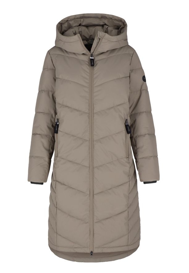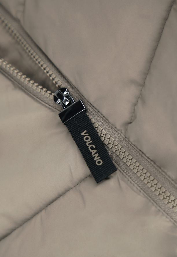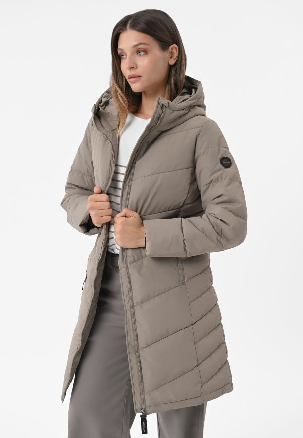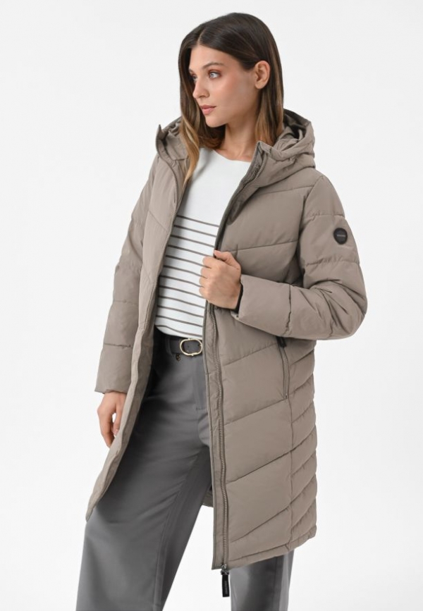 Béžová barva kabátu je klasikou, která se snadno hodí do každé zimní stylizace, dodává jí eleganci a nadčasový půvab. Jeho funkčnost zvyšuje minimalistická kapuce s možností stažení vnitřní šňůrkou na spodním okraji, což umožňuje lepší přizpůsobení postavě a dodatečnou tepelnou izolaci. Zimní, prošívaný kabát má dvě praktické boční kapsy na zip a jednu vnitřní kapsu, které zajišťují bezpečné místo pro drobnosti.