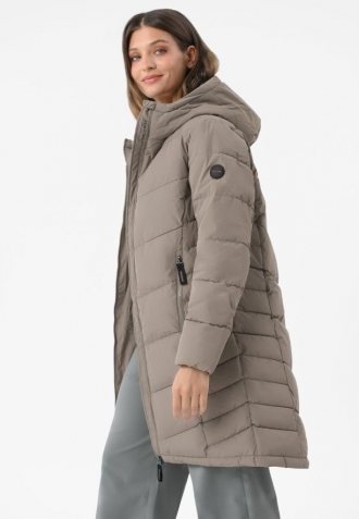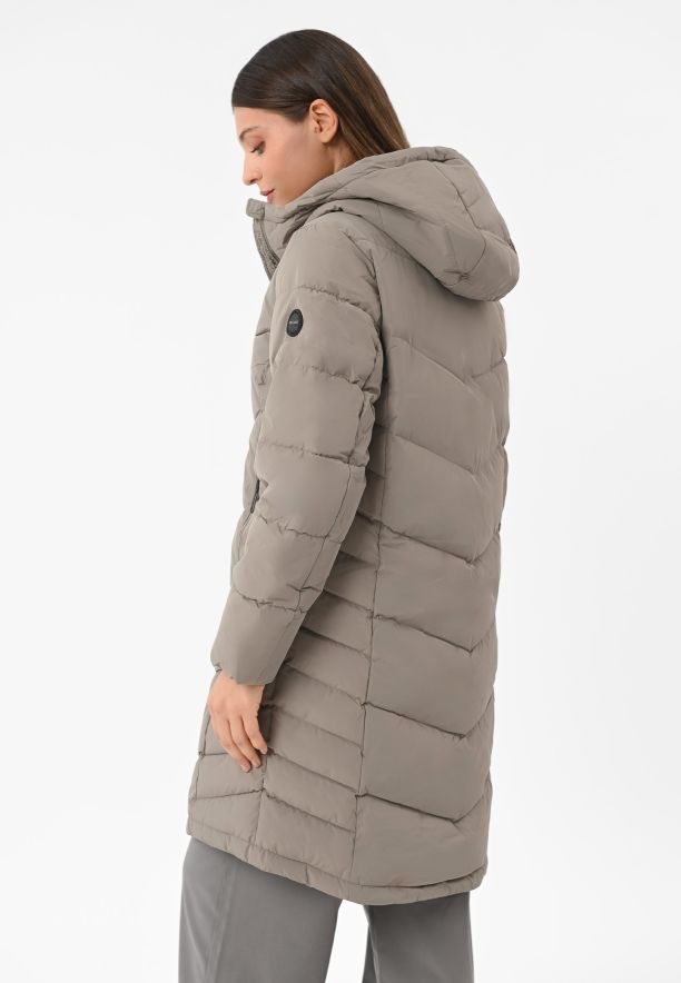 Tento béžový dámský zimní kabát byl vytvořen s ohledem na chladnější měsíce. Jeho výjimečnost podtrhuje odolný vrchní materiál, který je nejen odolný vůči povětrnostním podmínkám, ale také se vyznačuje šikmým prošíváním. Toto řešení dodává kabátu dynamický charakter a opticky zeštíhluje postavu, odlišuje ho od tradičních, horizontálně prošívaných modelů. Podšívka zvyšuje komfort nošení a rovný střih kabátu střední délky zajišťuje volnost pohybu a vynikající ochranu před chladem, zároveň si zachovává městskou eleganci. Celek doplňuje lehce prodloužený a zaoblený spodní okraj, který zimnímu kabátu dodává jemnou lehkost a moderní zakončení.