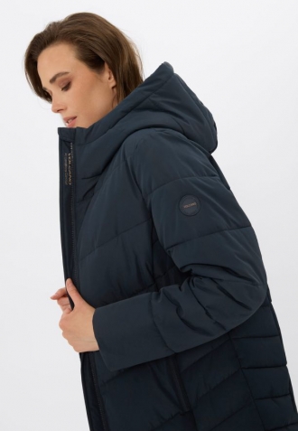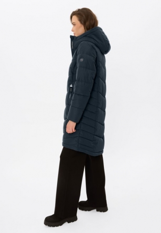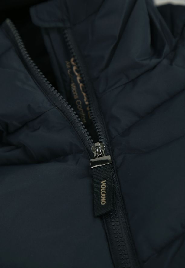 Tmavě modrá barva kabátu je klasikou, která se snadno hodí do každé zimní stylizace, dodává jí eleganci a nadčasový půvab. Jeho funkčnost zvyšuje minimalistická kapuce s možností stažení vnitřní šňůrkou na spodním okraji, což umožňuje lepší přizpůsobení postavě a dodatečnou tepelnou izolaci. Zimní, prošívaný kabát má dvě praktické boční kapsy na zip a jednu vnitřní kapsu, které zajišťují bezpečné místo pro drobnosti.