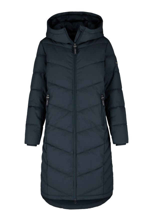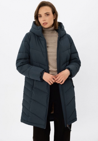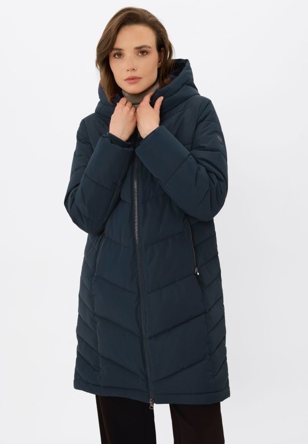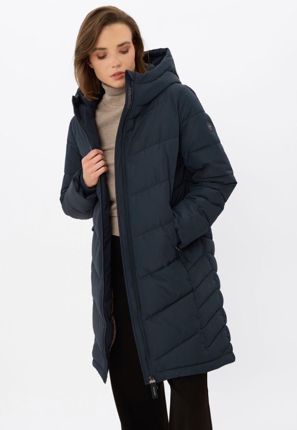 Tento tmavě modrý dámský zimní kabát byl vytvořen s ohledem na chladnější měsíce. Jeho výjimečnost podtrhuje odolný vrchní materiál, který je nejen odolný vůči povětrnostním podmínkám, ale také se vyznačuje šikmým prošíváním. Toto řešení dodává kabátu dynamický charakter a opticky zeštíhluje postavu, odlišuje ho od tradičních, horizontálně prošívaných modelů. Podšívka zvyšuje komfort nošení a rovný střih kabátu střední délky zajišťuje volnost pohybu a vynikající ochranu před chladem, zároveň si zachovává městskou eleganci. Celek doplňuje lehce prodloužený a zaoblený spodní okraj, který zimnímu kabátu dodává jemnou lehkost a moderní zakončení.