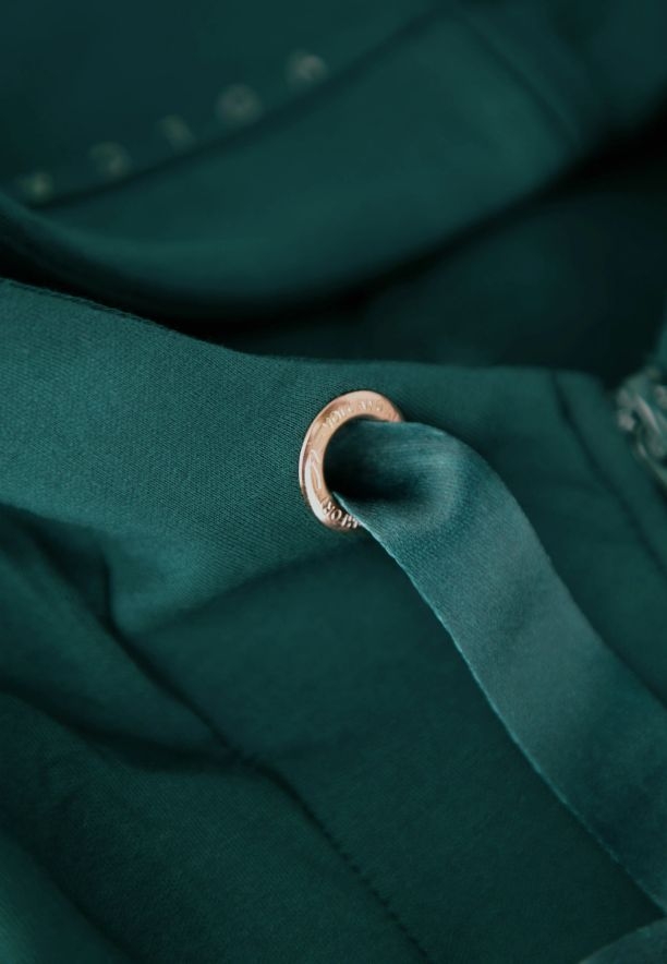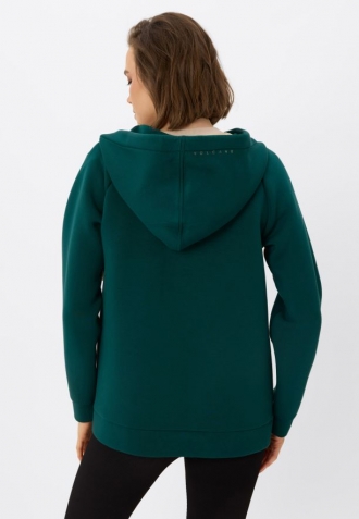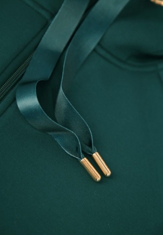 Pro zvýšení komfortu nošení naše návrhářky přidaly k mikině prostornou kapuci, ozdobenou širokými šňůrkami. Díky tomu tato dámská mikina získává sportovní, a zároveň stylový charakter. Funkčnost dodávají dvě vsazené kapsy, ideální pro zahřátí rukou nebo uložení drobných předmětů.