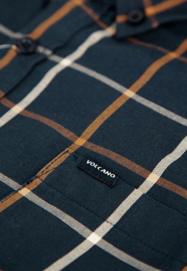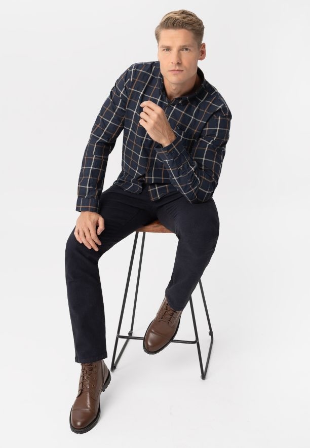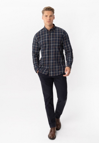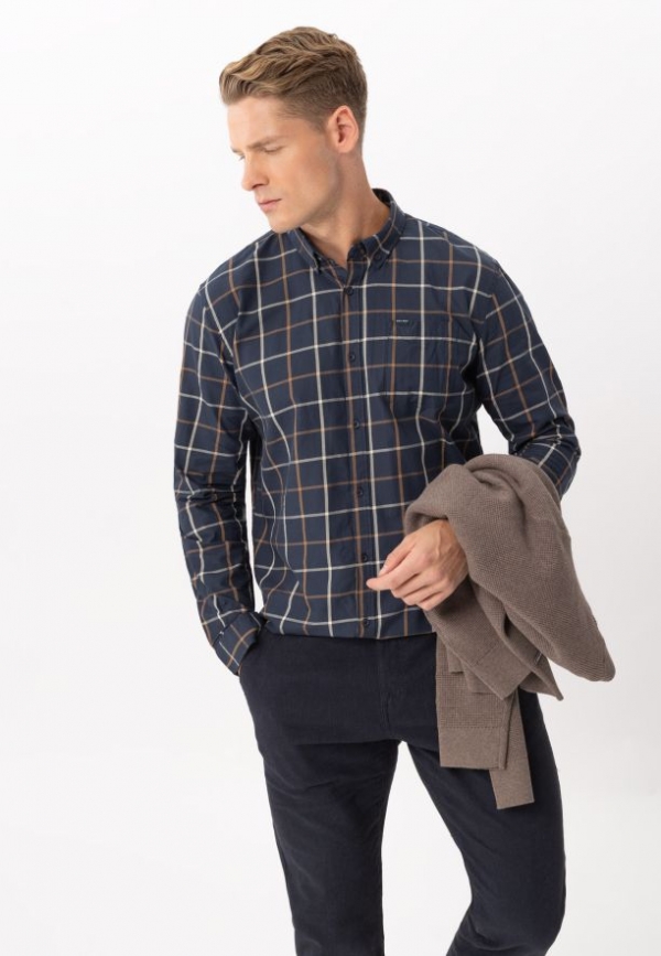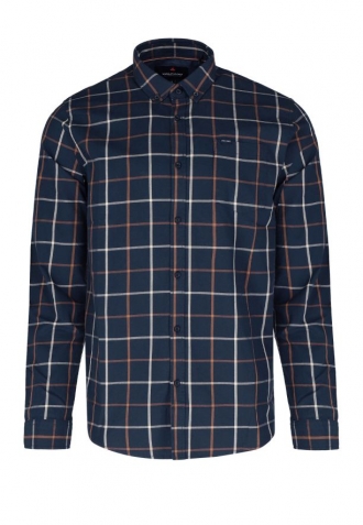 Tmavě modrá košile K-MARONI má kostkovaný vzor. Jedná se o kostku windowpane (okenní). Ta se vyznačuje výraznými, tenkými liniemi, které se protínají a vytvářejí velká, prázdná "okna" na jednotné barvě. V tomto případě jsou linky v krémové a oranžové barvě na tmavě modrém pozadí. Je to velmi módní model pánské košile, který se jistě bude líbit milovníkům kostkovaných košil.