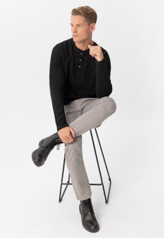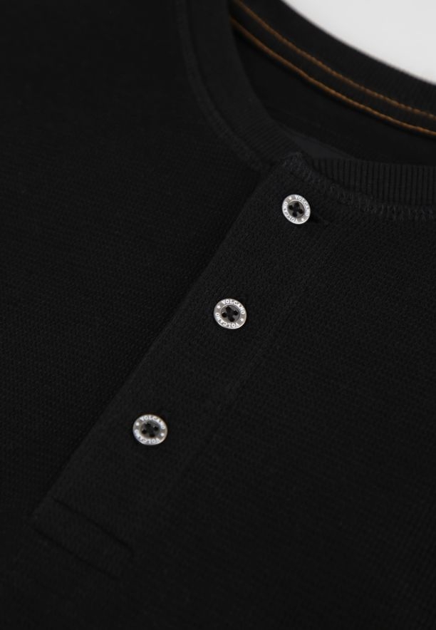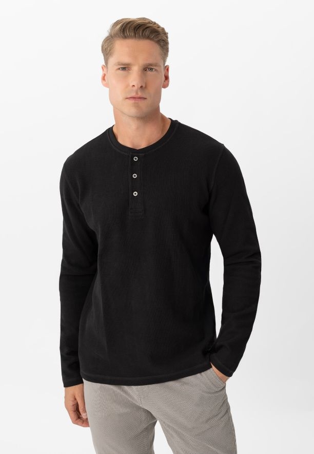 L-AZUX je podzimní a zimní verze klasického longsleevu. Vyznačuje se mírně silnějším a masitějším materiálem a strukturou materiálu. Struktura dodává pánskému tričku charakter, ale také, v kombinaci s tloušťkou materiálu a hustotou tkaní, pomáhá zachovat určitý tvar. A náš černý longsleeve L-AZUX má střih regular. Je volný, ale ne příliš objemný a hodí se na většinu pánských postav.