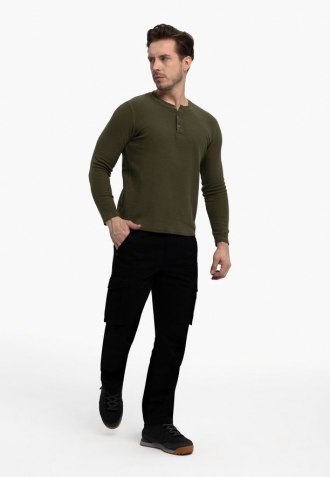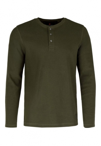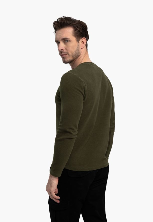 L-AZUX je podzimní a zimní verze klasického longsleevu. Vyznačuje se mírně silnějším a masitějším materiálem a strukturou materiálu. Struktura dodává pánskému tričku charakter, ale také, v kombinaci s tloušťkou materiálu a hustotou tkaní, pomáhá zachovat určitý tvar. A náš khaki longsleeve L-AZUX má střih regular. Je volný, ale ne příliš objemný a hodí se na většinu pánských postav.