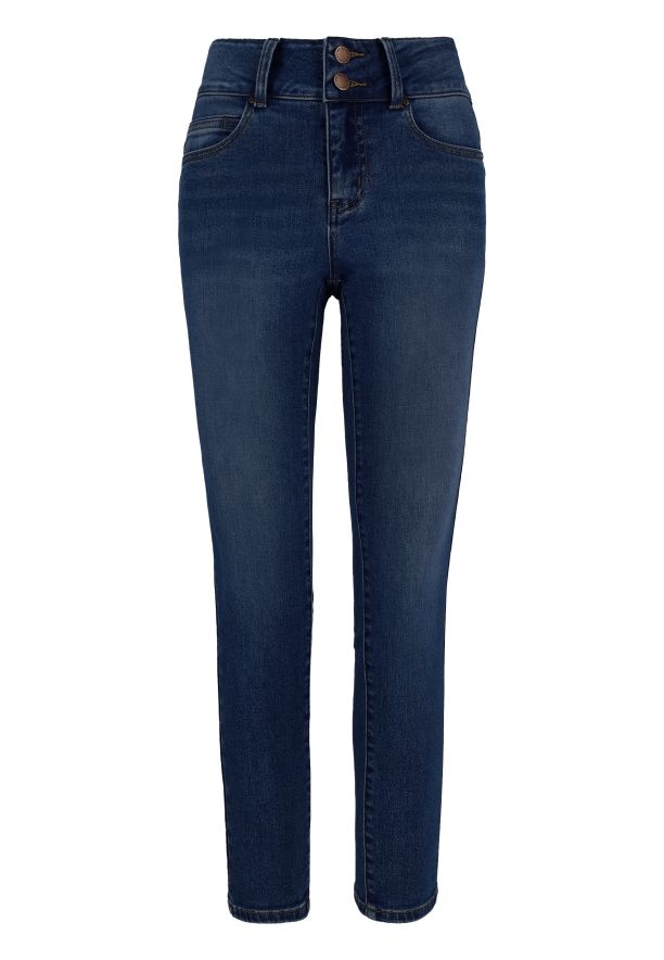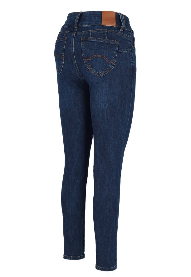 Netypickým řešením u tohoto modelu je systém zapínání na dva horní knoflíky a zip. To vytváří ozdobný efekt a zároveň drží břicho „na místě“. Přestože džínové kalhoty přiléhají k postavě, neomezují v pohybu. Děje se tak proto, že jsou ušity z materiálu s přídavkem elastanu.