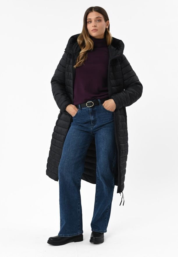 Tento teplý kabát má černou barvu, která se hodí prakticky ke všemu. Barva spolu s přiléhavým střihem zdůrazňují postavu a způsobují, že celek vypadá velmi elegantně. Podzimně - zimní dámský kabát má zabudovanou kapuci, která tvoří dodatečnou ochranu před větrem a deštěm. Stejně jako lišta skrývající zip, která nepropouští vítr dovnitř. Samotný zip je vybaven pohodlnými látkovými úchyty, které usnadňují jeho otevírání a zavírání.