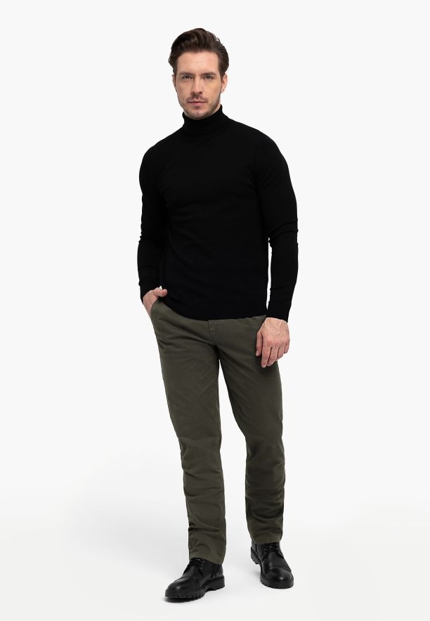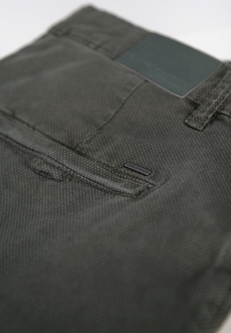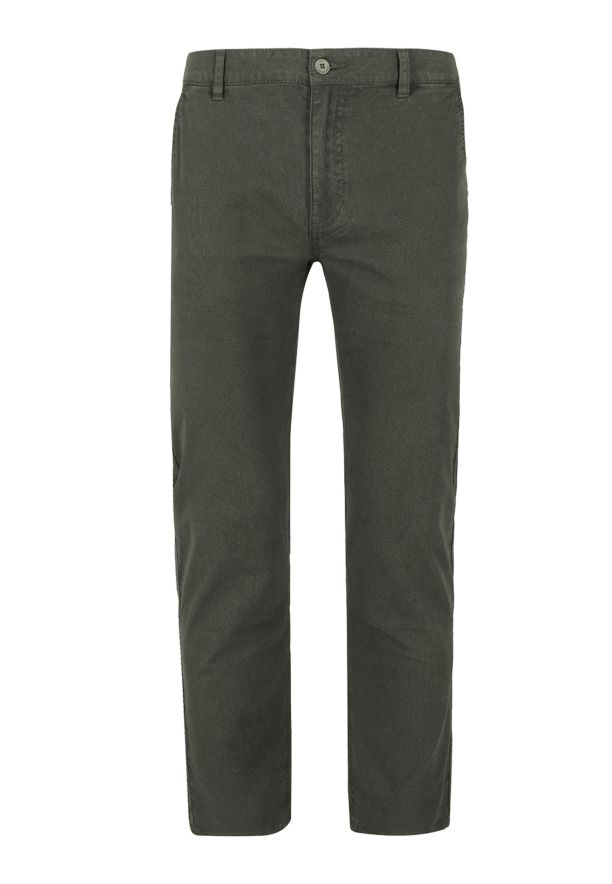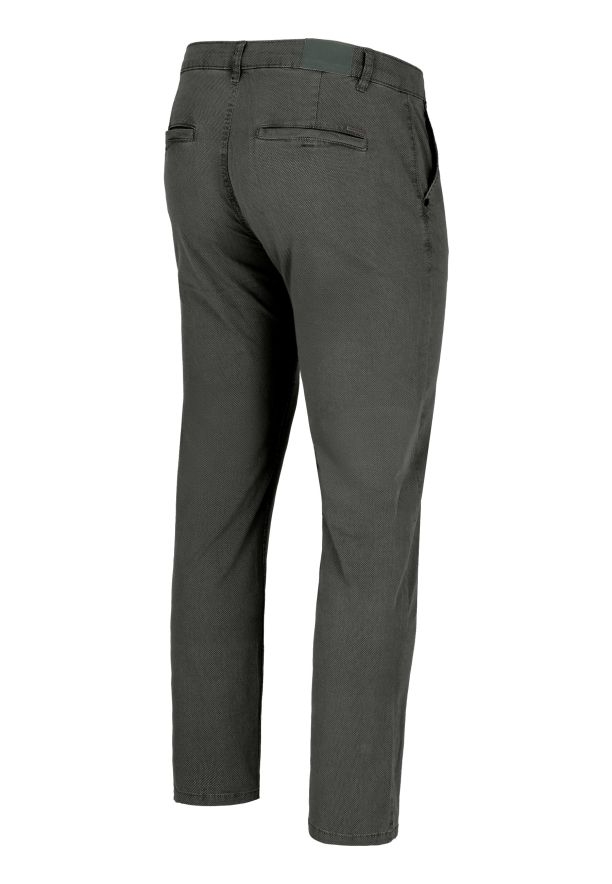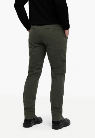 Klasické pánské kalhoty chino R-FOST jsou ideální volbou pro muže, kteří si cení casual stylu. Byly ušity z tkaniny složené z 98 % bavlny / 2 % elastanu, což zajišťuje dostatečnou prodyšnost, elasticitu a odolnost proti deformaci. Materiál má jemný mikrovzor, který celku dodává elegantně-casualový charakter, bez efektu „hladké nudy“. Gramáž materiálu a zelená barva zajišťují, že se kalhoty hodí po většinu roku.