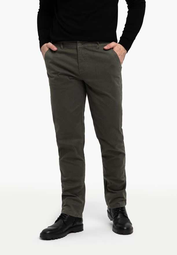 Kalhoty mají jednoduchý střih typu Regular Fit, rovnou nohavici a střední pas, což zajišťuje pohodlné usazení v pase a volnost pohybu. Zesílené švy v kritických místech prodlužují životnost výrobku. Díky tomu se kalhoty skvěle přizpůsobí postavě a hodí se pro každou příležitost – od každodenních vycházek po ležérnější setkání. Jejich tlumená barva a jemný vzor usnadňují výběr doplňků a univerzální střih nevyjde z módy po jedné sezóně. Pokud hledáte kalhoty, které kombinují styl s pohodlím – právě jste je našli.