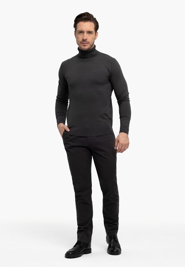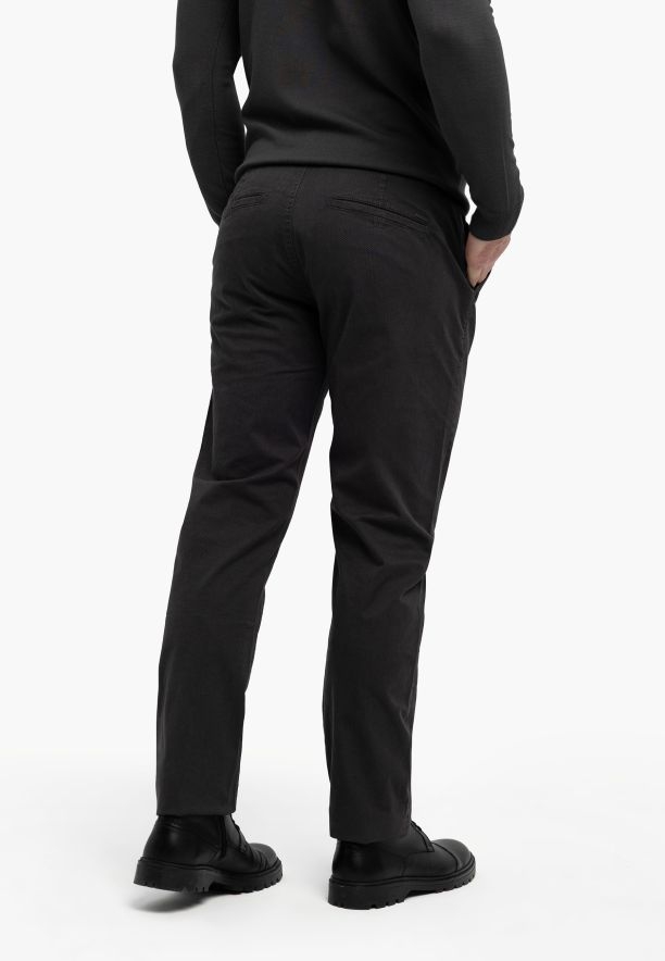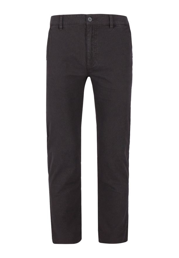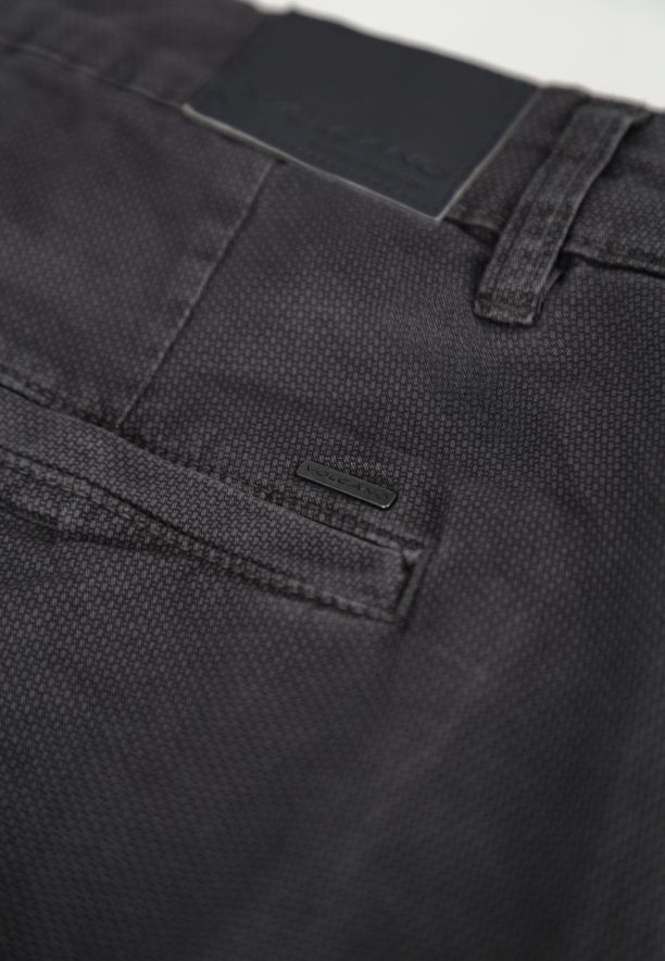 Klasické pánské kalhoty chino R-FOST jsou ideální volbou pro muže, kteří si cení casual stylu. Byly ušity z tkaniny složené z 98 % bavlny / 2 % elastanu, což zajišťuje dostatečnou prodyšnost, elasticitu a odolnost proti deformaci. Materiál má jemný mikrovzor, který celku dodává elegantně-casualový charakter, bez efektu „hladké nudy“. Gramáž materiálu a grafitová barva zajišťují, že se kalhoty hodí po většinu roku.