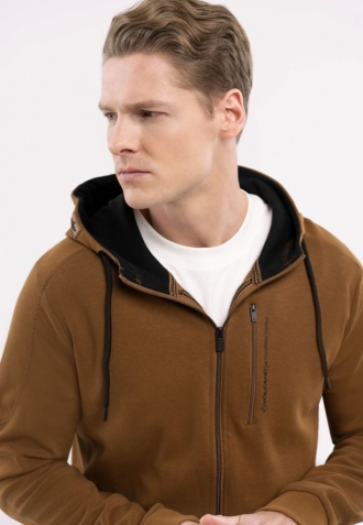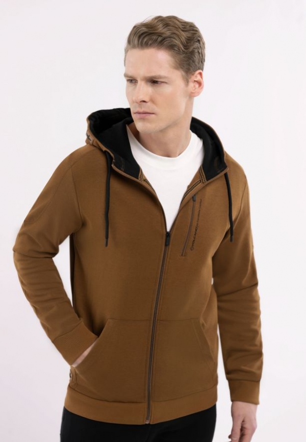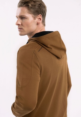 Klasická pánská mikina na zip. Vyniká jednoduchým, tradičním střihem, stylovou velbloudí barvou a kapucí se stahovacími šňůrkami, která chrání před chladem a větrem. Zip usnadňuje oblékání a svlékání mikiny.