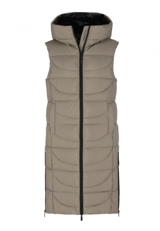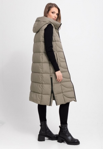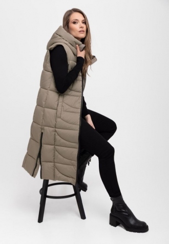 Tato dlouhá prošívaná dámská vesta v univerzálním béžovém odstínu je ideálním kouskem šatníku na přechodná roční období. Její střih účinně chrání před chladem a zároveň zajišťuje volnost pohybu. Prošívání opticky zeštíhluje postavu a kontrastní zip po celé délce vesty je praktickým a estetickým detailem. Model má pohodlnou kapuci, která dodatečně chrání před větrem a deštěm, a také rozparky po stranách, zvyšující komfort nošení a dodávající moderní charakter.