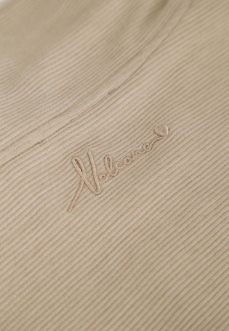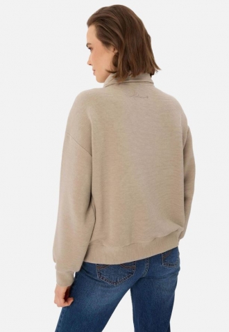 Béžová mikina je vyrobena z žebrované pleteniny s výraznou, vodorovnou strukturou a okouzluje svou texturou a měkkostí. Charakteristická pro tuto mikinu je vysoký stojáček se zipem, který umožňuje regulaci výstřihu, nabízí jak dodatečné teplo, tak i možnost vytvoření módního, casualového looku. Volný střih, se sníženou linií ramen a lemy na manžetách a na spodním lemu, zajišťuje maximální volnost pohybu a dokonalé přizpůsobení každé postavě, činíc ji ideálním návrhem pro každý den.