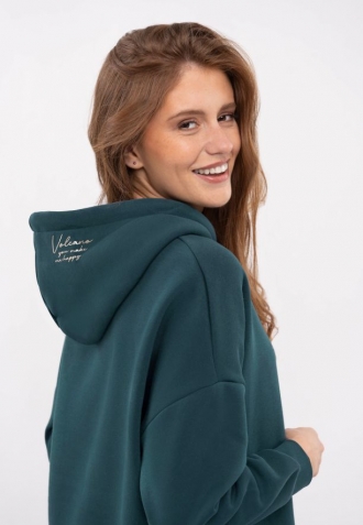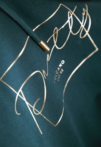Mikinu tyrkysové barvy zdobí lesklý potisk. Optimistický slogan najdete na přední straně mikiny, stejně jako na kapuci. Šňůrky na kapuci jsou zakončeny zlatou barvou. Konce šňůrek zdobí vyrytý nápis Volcano.