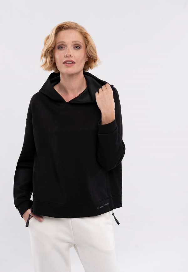 B-MIDA je dámská mikina pro volný čas v černé barvě. Lze ji kombinovat s širokými tepláky N-EVA a vytvořit tak ležérní teplákovou soupravu.
