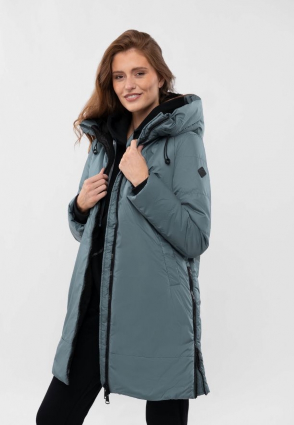 Dámský kabát J-ADRIA na podzim a mírnou zimu se zapíná na plastový dvoucestný zip, který umožňuje kabát snadno oblékat a svlékat. Takový zip také umožňuje regulovat větrání při změně povětrnostních podmínek. Zipy na bocích umožňují upravit střih kabátu, což je užitečné zejména při intenzivní aktivitě nebo při nošení vrstveného oblečení. Manžety s vnitřním pleteným žebrováním poskytují dodatečnou ochranu před chladem tím, že brání vnikání studeného vzduchu do kabátu. Volný spodní lem kabátu zaručuje pohodlí a volnost pohybu, což je ideální pro každodenní aktivity.