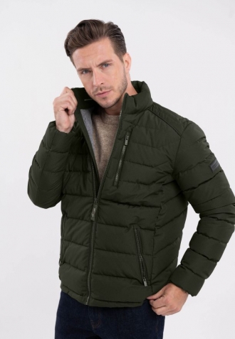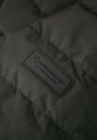 Pánská prošívaná bunda byla ušita v klasickém střihu. Je rovná a ve spodní části zakončená bočními švy. Prošívání zajišťuje rovnoměrné rozložení výplňových komor, a tím i hřejivost. Další teplo zajišťuje límec zakončený na vnitřní straně příjemným úpletem. Co tuto prošívanou pánskou bundu odlišuje, je šedá podšívka s velkým nápisem Volcano.