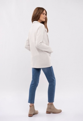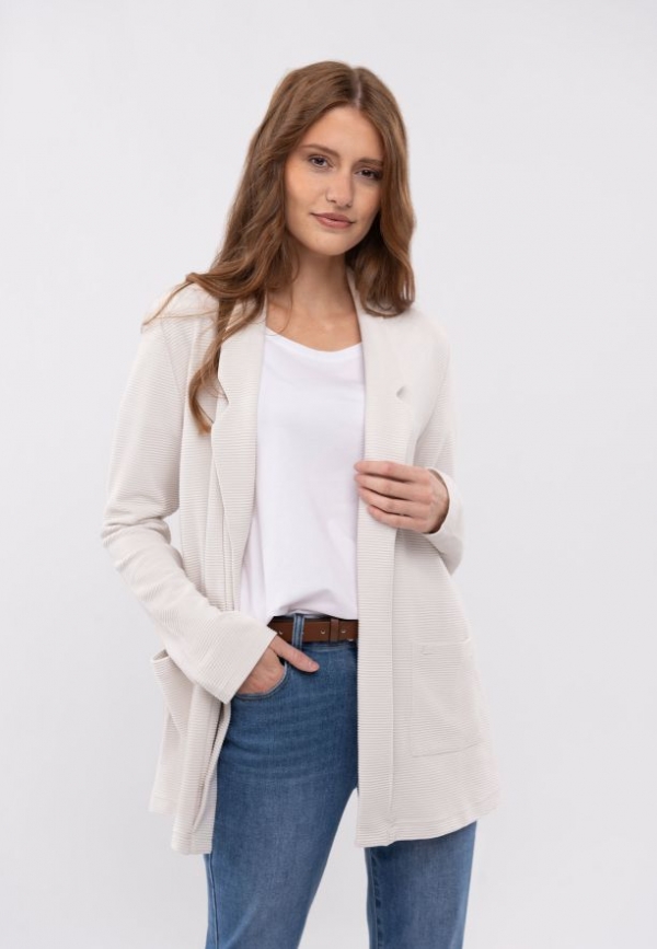 Tento béžový dámský pruhovaný blejzr má všestranný charakter a je ideální pro každodenní ležérní styling i formálnější příležitosti. Díky tomu, že spodní lem a manžety rukávů nemají žebrování, vypadá sako moderně a zároveň zůstává mimořádně funkčním kusem oblečení.