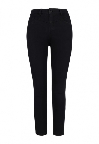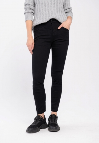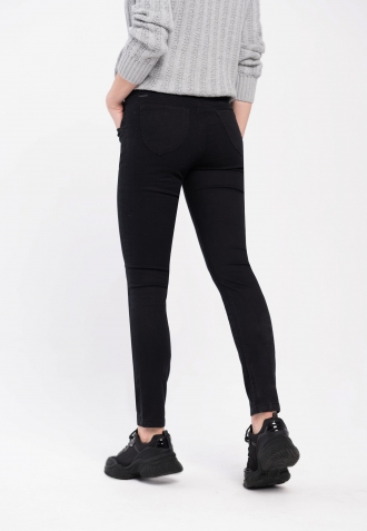 Dámské kalhoty Slim jsou celé černé. Černé jsou také doplňky a prošívání. Kalhoty mají sadu čtyř skutečných kapes. Ty vzadu jsou půlkulaté a pěkně zdůrazňují hýždě.
