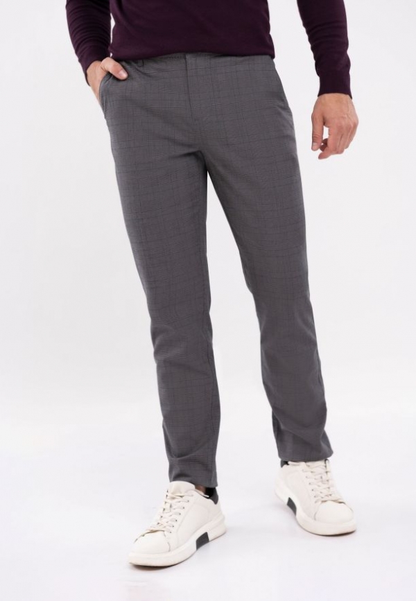 Pánské látkové kalhoty mají kostkovaný vzor a grafitovou barvu. Chinos kalhoty šité na míru mají dvě šikmé kapsy na přední straně a dvě kapsy na zadní straně, našité mírně šikmo. Zapínají se na zip a knoflík pro bezpečné zapínání a snadné používání. Poutka na opasek umožňují přizpůsobit styl přidáním oblíbeného pásku.