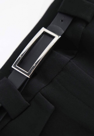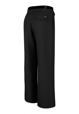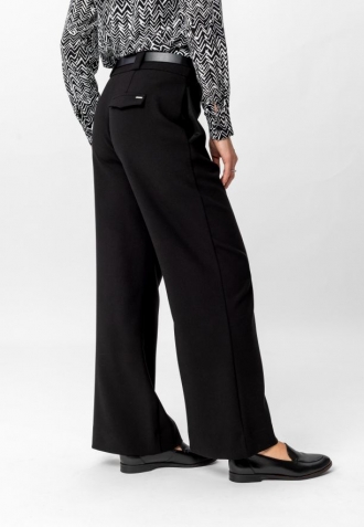 Kalhoty R-MILEN jsme ušili z tlustší, příjemné na dotek tkaniny. Taková tkanina v kombinaci s volným střihem dodává kalhotám noblesu a šik. Stojí za zmínku také to, že směs viskózy a polyesteru s elastanem způsobuje, že černé kalhoty jsou prodyšné, krásně sedí na postavě. Kalhoty můžete doplnit sakem JB-MIRELLA.