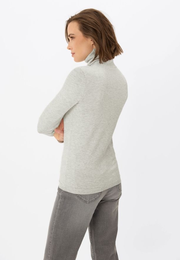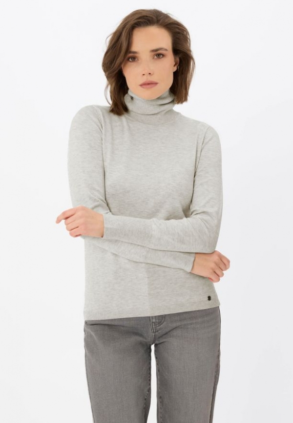 Šedý svetr s rolákem má přiléhavý střih a podtrhuje postavu. Rukávy jsou zakončeny širokými, žebrovanými manžetami. Celý střih je jednoduchý, elegantní a doplněný bižuterním detailem Volcano.