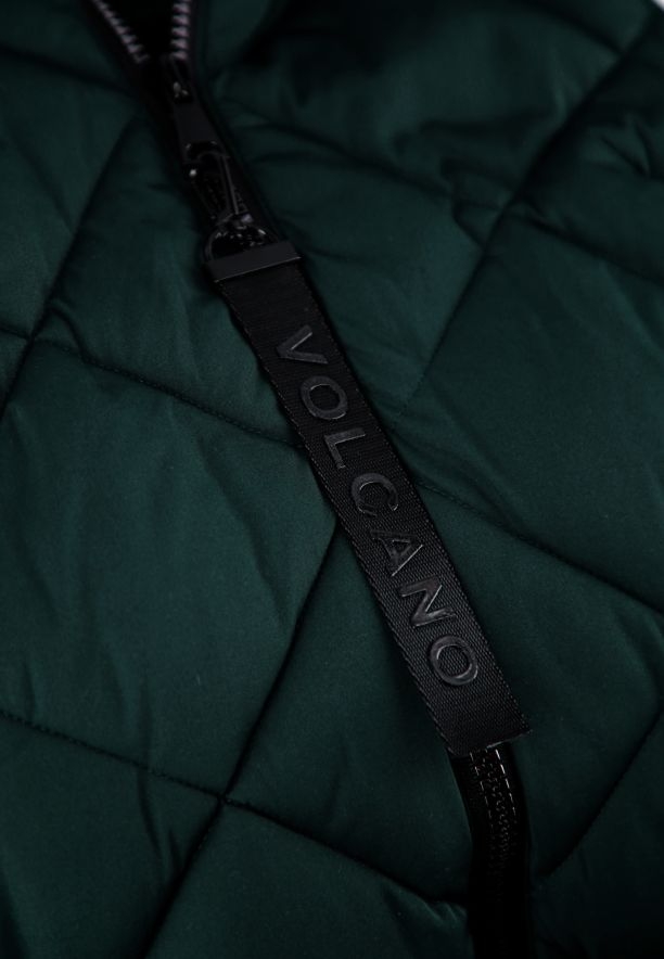 V-LEA je prošívaná dámská vesta s diamantovým vzorem, která má integrovanou kapuci. Kapuce je zdobena páskou s nápisem Volcano a stahuje se vnitřní šňůrkou, aby dokonale padla a poskytovala dodatečnou ochranu před větrem. Díky dvoucestnému plastovému zipu s ochranou brady se vesta pohodlně nosí a její zapínání na kroužek v podobě klíčenky jí dodává jedinečný vzhled. Dvě kapsy na zip jsou praktickým řešením pro bezpečné uložení drobných předmětů.