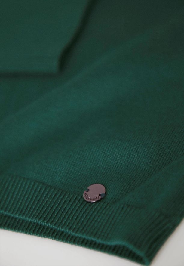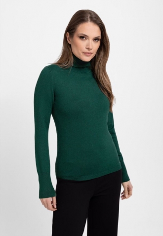 Zelený svetr s rolákem má přiléhavý střih a podtrhuje postavu. Rukávy jsou zakončeny širokými, žebrovanými manžetami. Celý střih je jednoduchý, elegantní a doplněný bižuterním detailem Volcano.