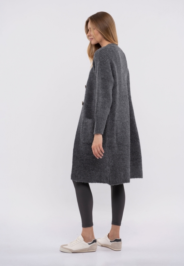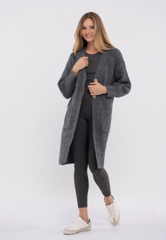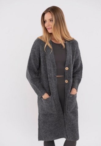 Dlouhý dámský svetr na knoflíky. Kardigan má volný střih, sahající ke kolenům. Díky tomu je ideální pro nošení na podzim a v zimě i jako svrchní oděv v teplejších dnech. Je pohodlný a ležérní a hodí se k džínům, legínám i sukni.