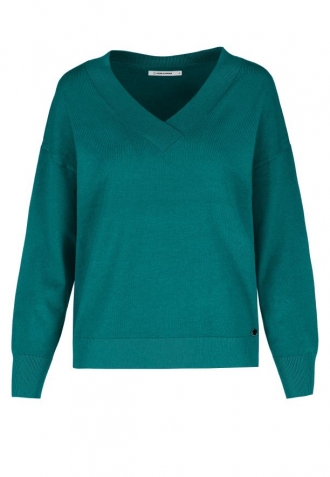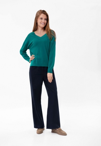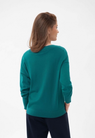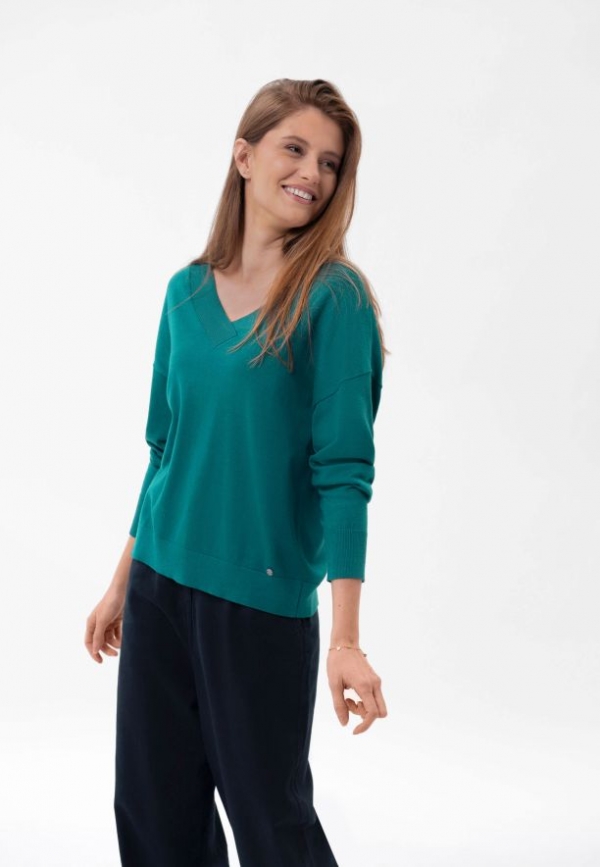 Dámský svetr S-JOY volného střihu v základním provedení. Krátký střih zvýrazňuje siluetu, zatímco hladký úplet působí decentním, minimalistickým dojmem. Díky střihu Comfort Fit svetr poskytuje volnost pohybu a pohodlí, takže je ideální pro každodenní nošení. Výstřih do V zakončený žebrovaným lemem dodává svetru elegantní vzhled.