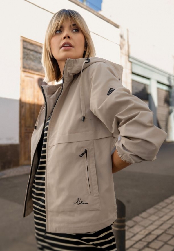 J-MALAGA je dámská přechodná bunda s kapucí. Kapuce na této bundě je prostorná a zakončená vázačkami. Ta účinně chrání před větrem a deštěm a díky páskům je pohodlně nastavitelná. Stojí za zmínku, že tato volná bunda je ušitá z odolného polyesteru, díky čemuž je trvanlivá a odolná vůči lehkému dešti.