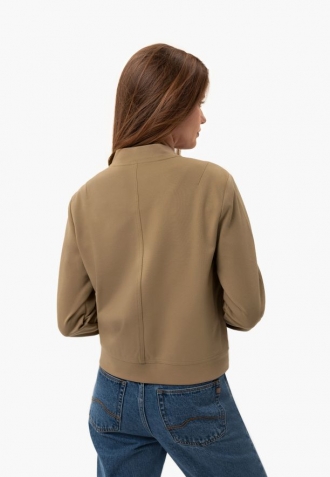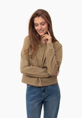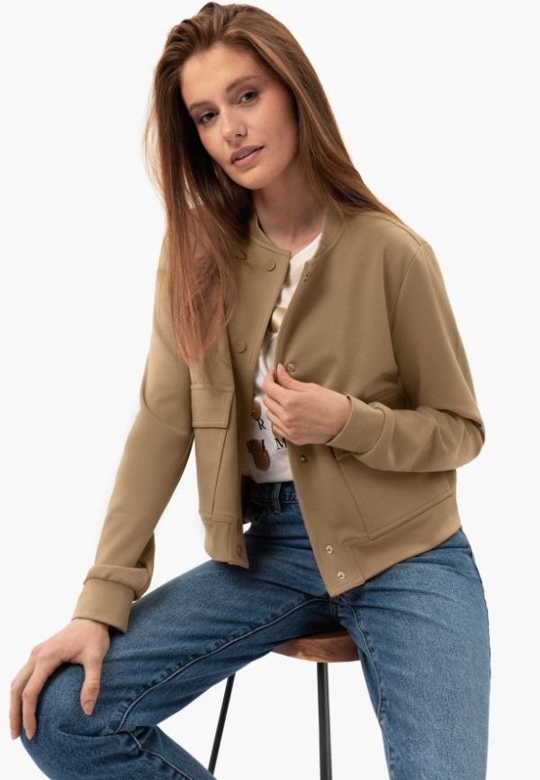 Tato dámská bunda typu bomber je kombinací pohodlí a moderního stylu. Střih připomíná bundy typu bomber. Krátká béžová bunda je vyrobena z hladké tkaniny - směsi viskózy, polyesteru a elastanu. Díky přírodním viskózovým vláknům je tkanina vzdušná a měkká, zatímco přídavek polyesteru a elastanu zajišťuje odolnost a pružnost, takže se bunda přizpůsobí postavě, aniž by omezovala v pohybu.