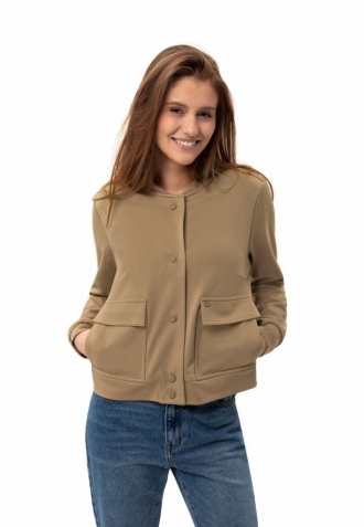 Model J-KALIA je dámská látková bunda, která vyniká jednoduchým krátkým střihem a límcem ve stylu baseballu, který jí dodává sportovní nádech. Bunda se zapíná na patentky, takže její oblékání je rychlé a pohodlné. Volné látkové žebrování na spodním lemu a manžetách dodává celkovému vzhledu ležérní charakter, zatímco dvě našité kapsy s ozdobnými klopami dodávají funkčnost a styl.