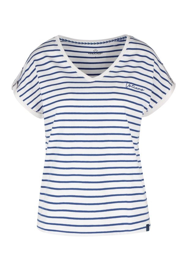 Ležérní styling nevylučuje efektní řešení! Dámské pruhované tričko T-PORTO se hodí ke kalhotám i sukním. Střih Comfort Fit, kimonové rukávy a hluboký výstřih dodávají tričku T-PORTO originální nádech. Jemné písmo v nápisu „Volcano“ na hrudi ladí se stylem trička.