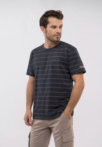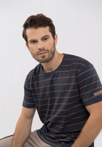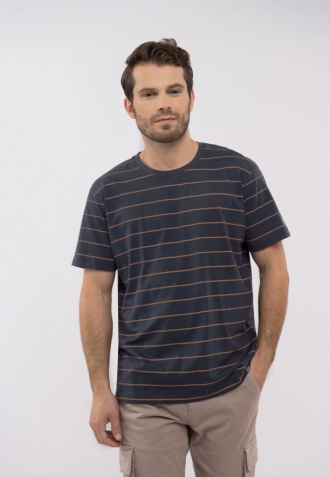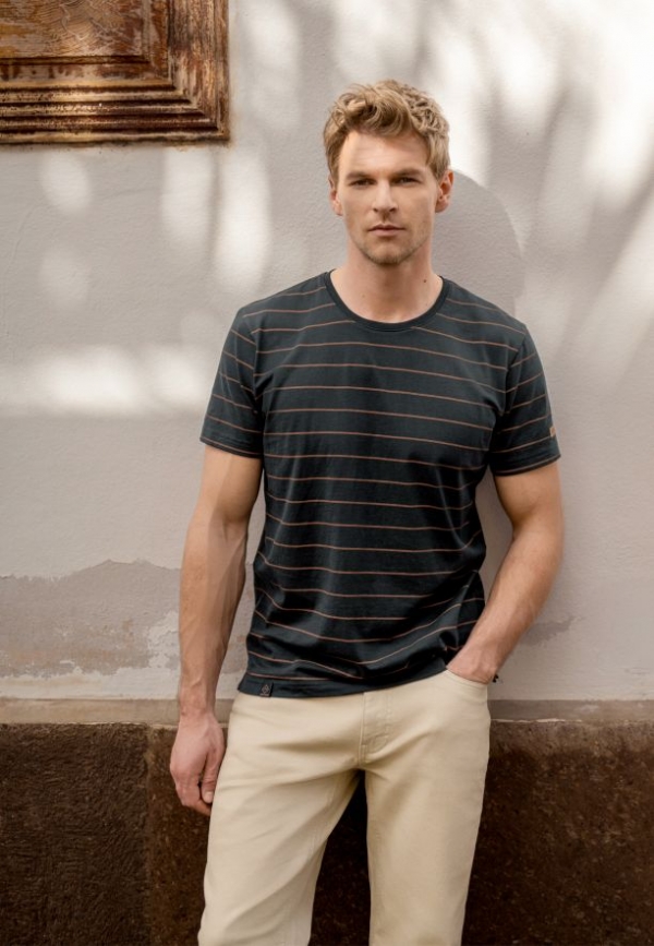 Pánské tričko T-ALLY je ušité z měkké, prodyšné bavlny, která zaručuje pohodlí při nošení po celý den. Navrhli jsme ho v klasickém, pravidelném střihu, díky čemuž neomezuje pohyb a dokonale se přizpůsobí postavě. Jemné, vodorovné pruhy v odstínu hnědé na tmavém pozadí mu dodávají nadčasový charakter a snadno se kombinují s mnoha prvky pánského šatníku.