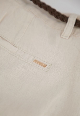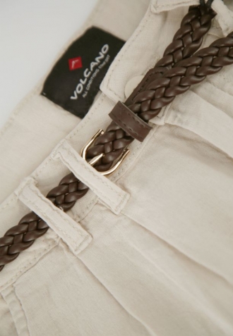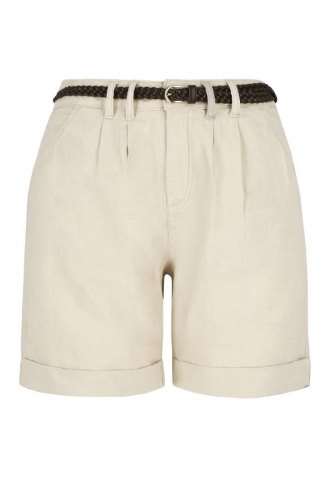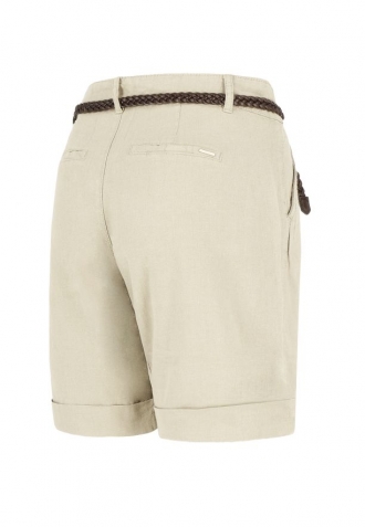 Dámské plátěné šortky mají dvě vsazené kapsy na drobnosti. Zapínají se na zip a knoflík a díky přídavným poutkům si je můžete stylově zavázat pleteným páskem, který je součástí soupravy. Krátké šortky mají volné nohavice a jejich ohrnuté manžety dodávají šmrnc a lehkost.