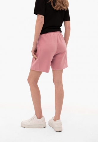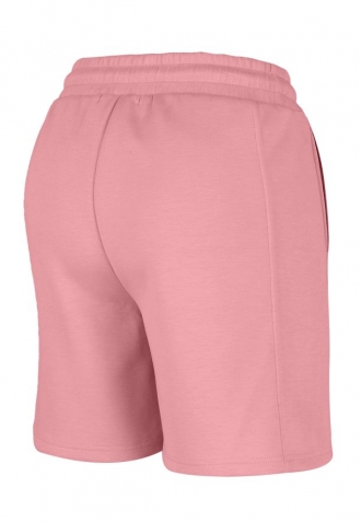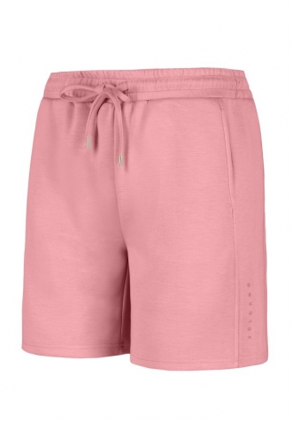 Shorts v růžové barvě mají v pase šňůrky pro dokonalé přizpůsobení a dvě boční kapsy na drobnosti. Na zadní straně nejsou žádné kapsy, což podtrhuje jejich minimalistický tvar. Ozdobné prošití na bocích šortek dodává sportovní nádech a pogumovaný nápis Volcano na levé nohavici je zajímavým akcentem, který vynikne na pozadí hladké látky.