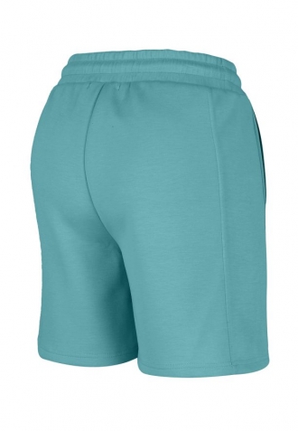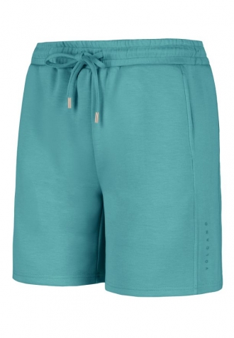 Shorts v tyrkysové barvě mají v pase šňůrky pro dokonalé přizpůsobení a dvě boční kapsy na drobnosti. Na zadní straně nejsou žádné kapsy, což podtrhuje jejich minimalistický tvar. Ozdobné prošití na bocích šortek dodává sportovní nádech a pogumovaný nápis Volcano na levé nohavici je zajímavým akcentem, který vynikne na pozadí hladké látky.