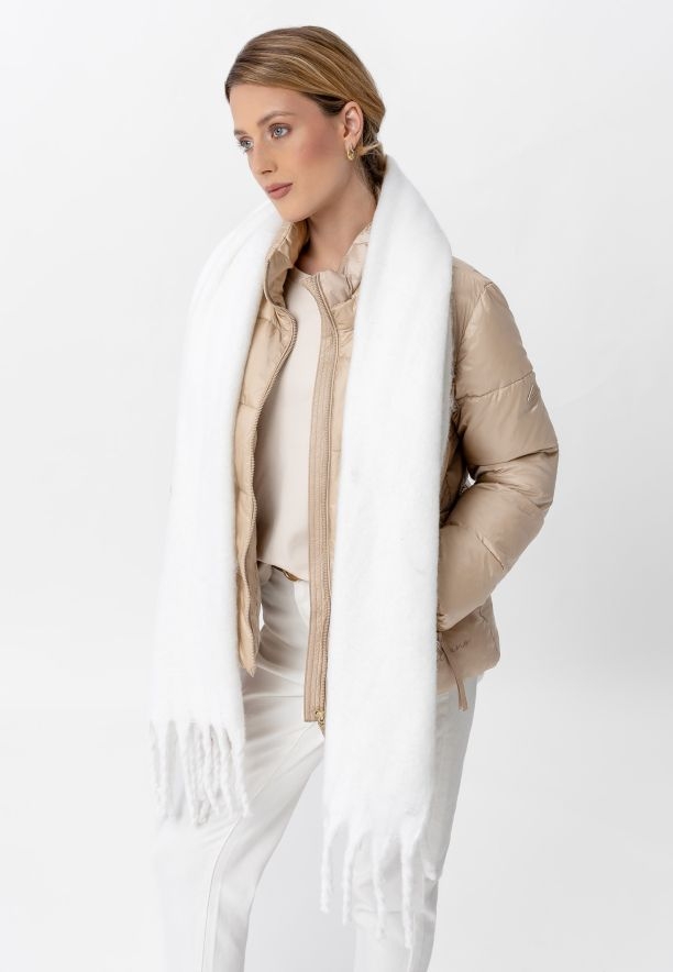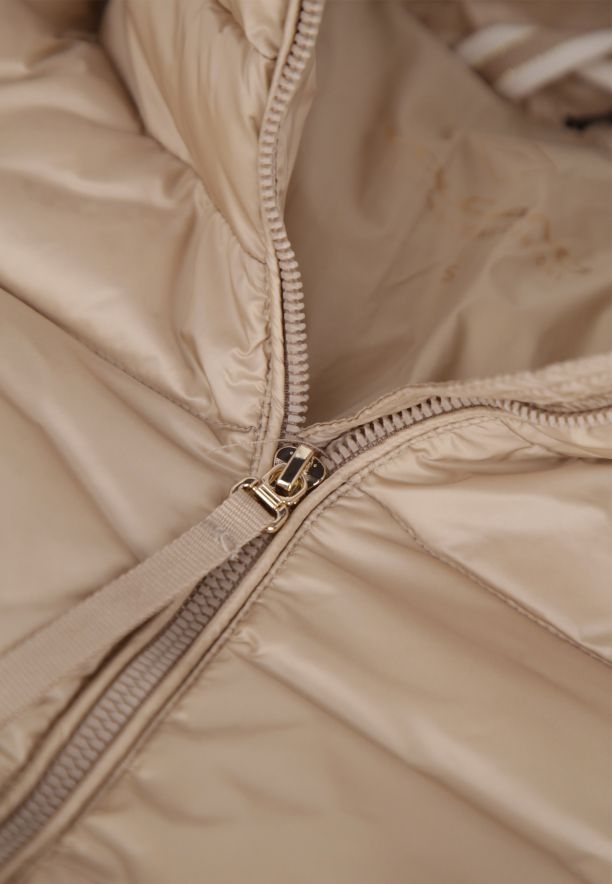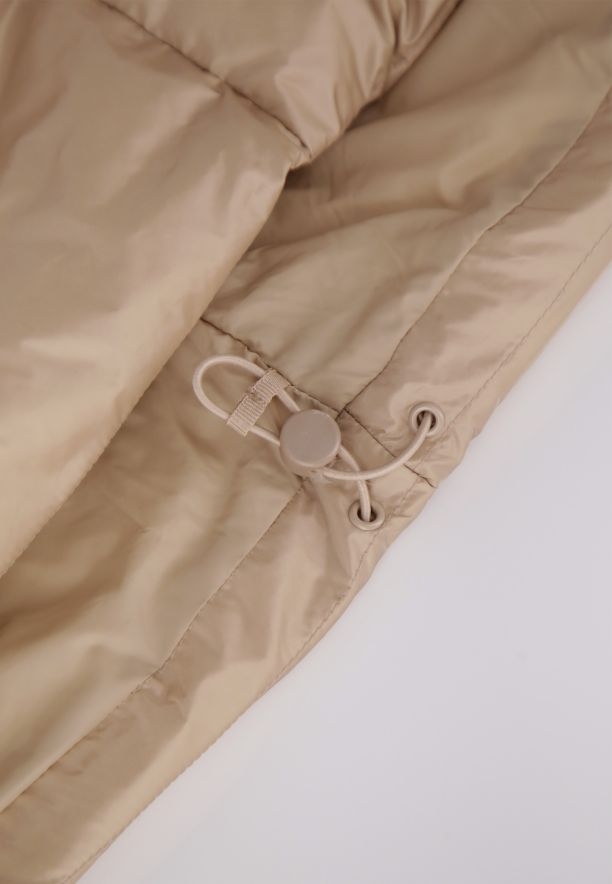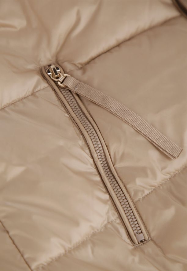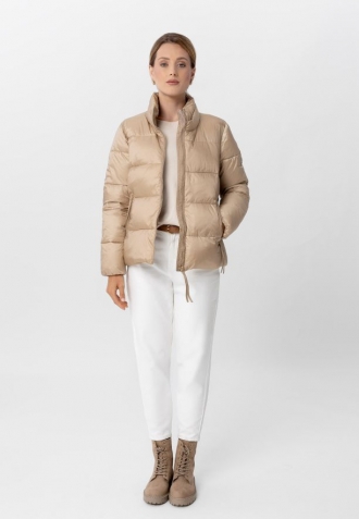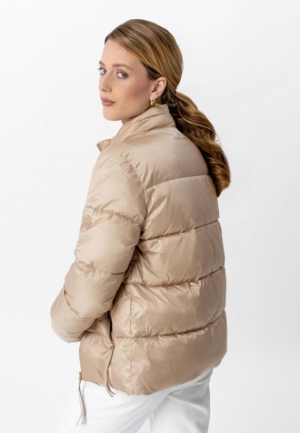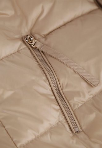 Béžová bunda má zlaté dekorativní prvky, široké prošívání a výplň z lehkého a nadýchaného termoizolačního vlákna z polyesteru. To zaručuje optimální teplo bez zbytečného zatížení, což činí bundu mimořádně pohodlnou na nošení. Vysoký límec dodatečně chrání krk před chladem, a praktické kapsy umožňují uložení drobných předmětů. Je to spolehlivý prvek šatníku, který se osvědčí jak při městských procházkách, tak i o víkendových výletech.