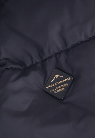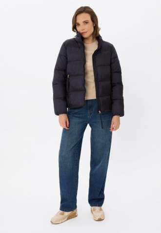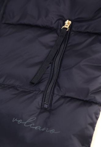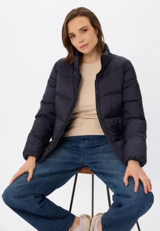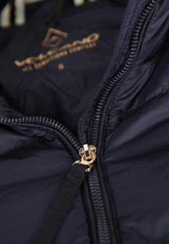 Tmavě modrá bunda má zlaté dekorativní prvky, široké prošívání a výplň z lehkého a nadýchaného termoizolačního vlákna z polyesteru. To zaručuje optimální teplo bez zbytečného zatížení, což činí bundu mimořádně pohodlnou na nošení. Vysoký límec dodatečně chrání krk před chladem, a praktické kapsy umožňují uložení drobných předmětů. Je to spolehlivý prvek šatníku, který se osvědčí jak při městských procházkách, tak i o víkendových výletech.