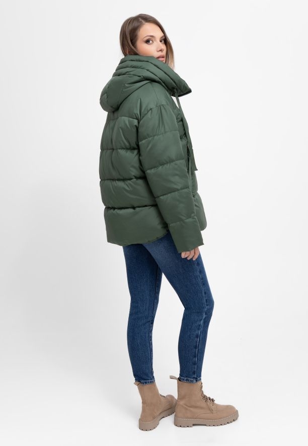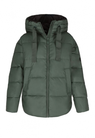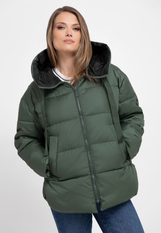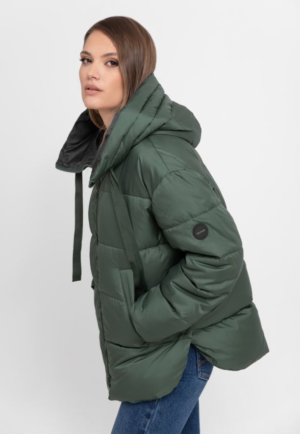 Bunda J-LAVEO má střih oversize. Její střih a délka ji činí ideální pro aktivní lidi, kteří nemají rádi, když je oblečení omezuje v pohybu. Dodatečnou výhodou bundy oversize je možnost regulace spodního okraje pomocí bočních knoflíků. Bunda má vysoký límec spojený s kapucí. Má na bocích dvě kapsy na patentky - jsou umístěny tak, aby se v nich daly pohodlně schovat a zahřát ruce.