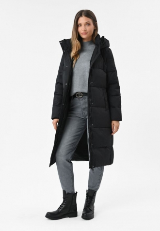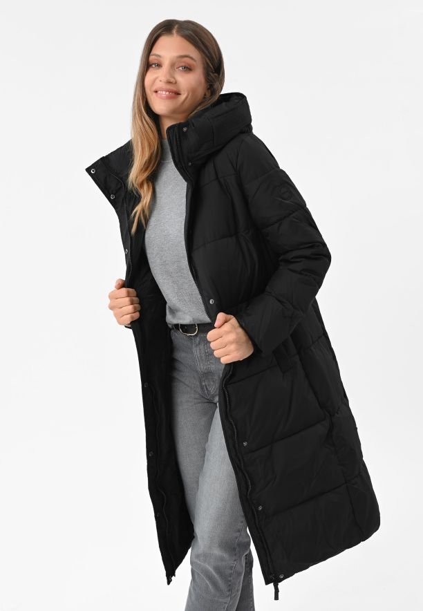 Dlouhý kabát je vybaven dvoucestným zipem skrytým pod ozdobnou lištou na patentky, což nejen dodává styl, ale také usnadňuje pohyb. Volnější spodní okraj zajišťuje volnost pohybu. Celek doplňují dvě praktické vnější kapsy, které jsou ideální pro zahřátí rukou nebo uložení drobností. Černý, prošívaný kabát J-SIMA je funkční a stylová volba pro každou ženu, která hledá komfort a teplo ve svém zimním šatníku.