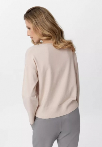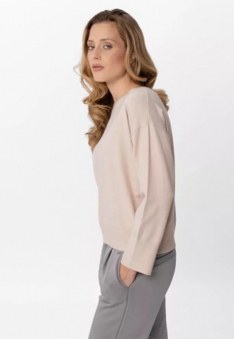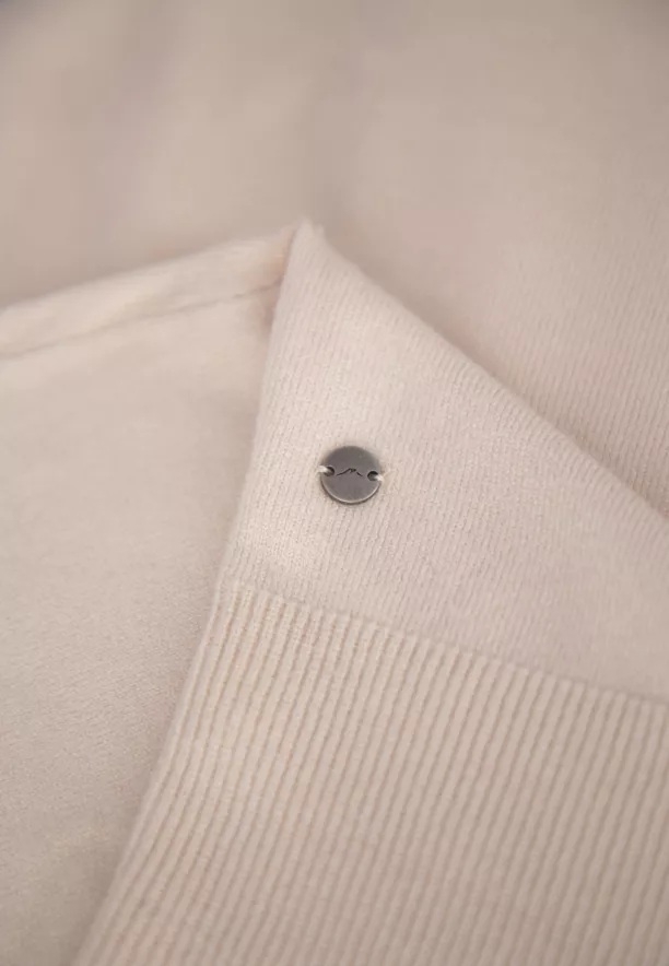 Volnější střih svetru s jemně sníženou linií ramen a klasický, půlkulatý výstřih zajišťují komfort nošení. Neutrální, světlá barva zajišťuje, že se hladký svetr snadno kombinuje s různými prvky šatníku – od džínsů a tenisek po elegantní kalhoty či sukně. Je to univerzální must-have, který se jistě rychle stane základem Vašich každodenních outfitů.