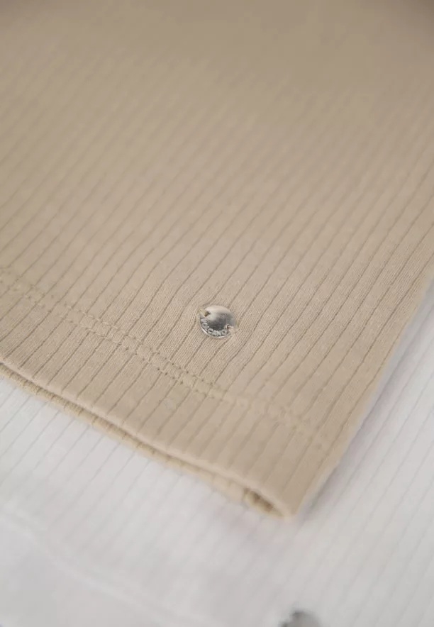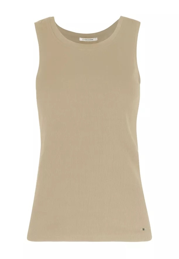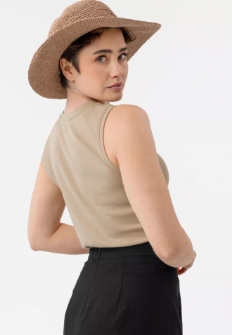 Univerzální dámské tílko na širokých ramínkách. Tílko je ušito z módního žebrovaného materiálu a má béžovou barvu. Střih Slim-Fit a jednotná barva umožňují top nosit jak samostatně, tak i pod sako, mikinu nebo svetr.